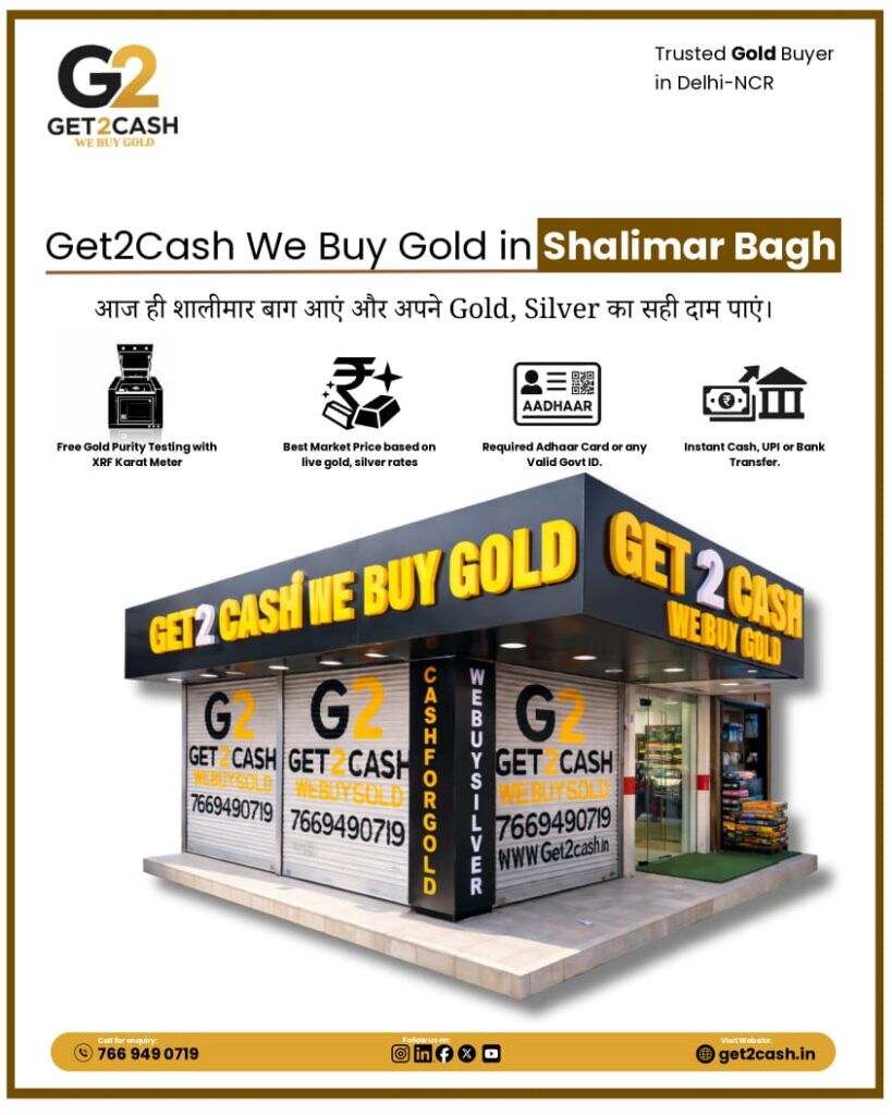 We are proud to announce the opening of our Get2Cash – We Buy Gold branch in Shalimar Bagh, Delhi, offering a safe, transparent, and hassle-free gold selling experience for people living in North-West Delhi. Our Shalimar Bagh branch is conveniently located for customers who want to sell their old gold jewellery, silver items, or diamond jewellery and receive instant cash at the best market price without any hidden charges. At Get2Cash We Buy Gold – Shalimar Bagh, our experienced team uses advanced German XRF gold purity testing machines to check the purity of your gold, silver, and diamond jewellery right in front of you. This modern testing technology ensures 100% accurate purity testing without breaking or melting your jewellery. The entire testing process is completely transparent and performed in front of the customer so that you can see the exact purity and weight of your valuables.