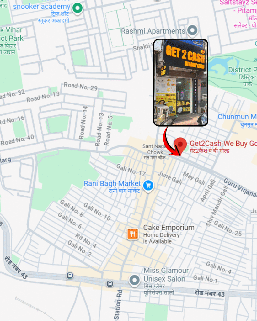 The Rani Bagh Get2Cash branch is one of Delhi’s most trusted destinations for people looking to sell gold, silver, or diamond jewellery at the best possible price. Located in the heart of Rani Bagh near Sant Nagar and Ram Handloom, this branch provides an easy, transparent, and secure experience for everyone looking to convert their valuables into instant money.